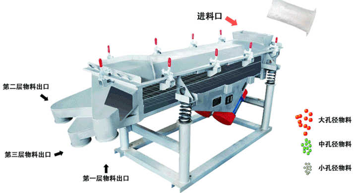 重型直線篩利用振動電機激振作為振動源,使物料在篩網上被拋起,同時向前作直線運動,物料從給料機均勻地進入篩分機的進料口,通過多層篩網產生數種規格的篩上物、篩下物、分別從各自的出口排出。具有耗能低、產量高、結構簡單、易維修、全封閉結構,無粉塵溢散,自動排料,更適合于流水線作業。