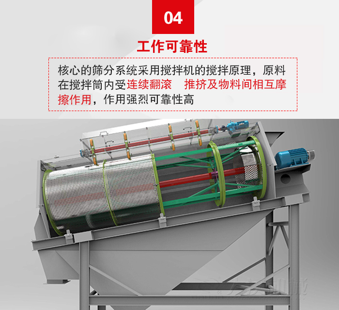 其核心的篩分系統采用攪拌機的攪拌原理,原料在攪拌筒內受連續翻滾、推擠及物料間相 互摩擦作用,作用強烈可靠性高。