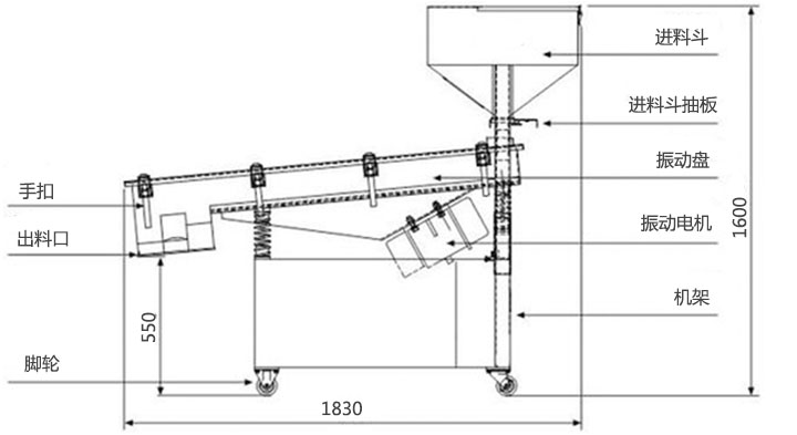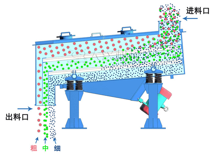篩料機底部的雙振動電機使篩面上的物料受其激振力的作用,向出料口方向跳躍式直線運動,小于篩孔的物料落到下層,徑出料口排出。