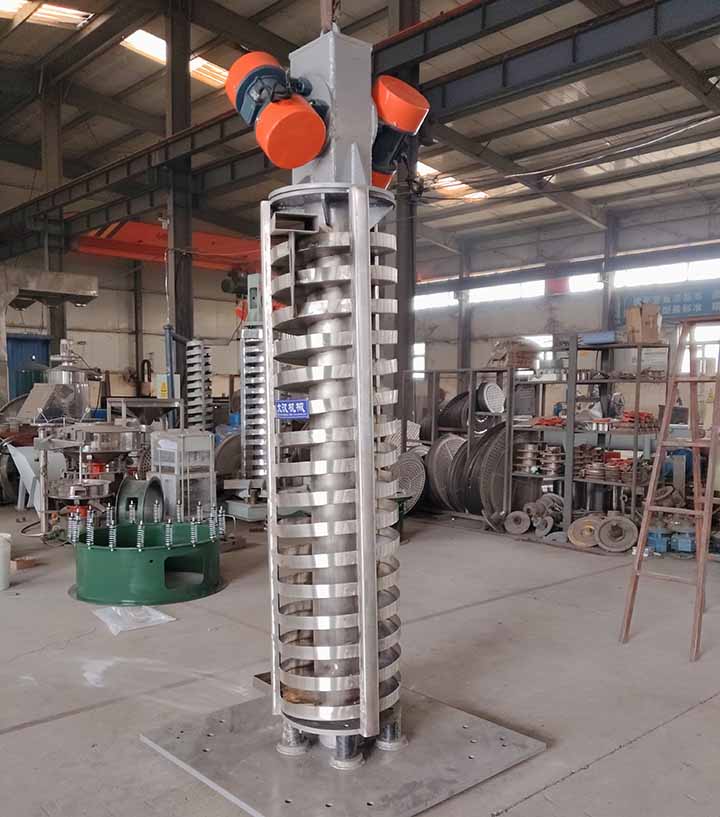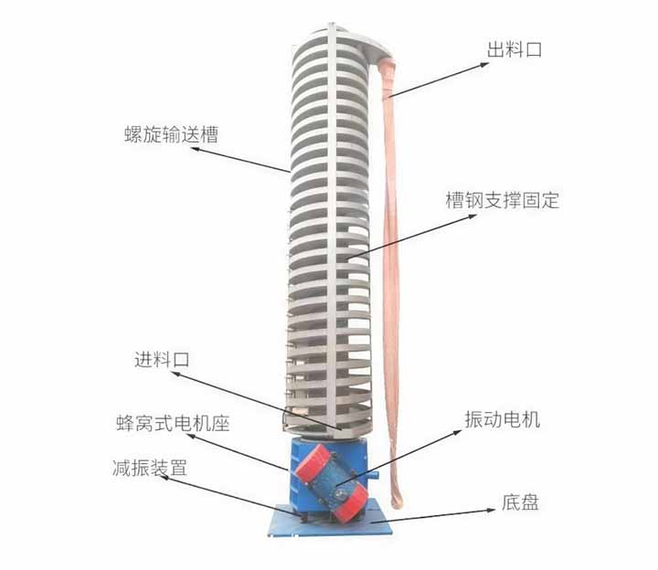 DZC系列垂直振動提升機的驅動裝置振動電機安裝在輸送塔下部,兩臺振動電機對稱交叉安裝,輸送塔由管體和焊接在管體周圍的螺旋輸送槽組成,輸送塔座于減振裝置上,減振裝置由底座和隔振彈簧組成。當垂直輸送機工作時,根據雙振動電機自同步原理,由振動電機產生激振力,強迫整個輸送塔體作水平圓運動和向上垂直運動的空間復合振動,螺旋槽內的物料則受輸送槽的作用,作勻速拋擲圓運動,沿輸送槽體向上運動,從而完成物料的向上(或向下)輸送作業。