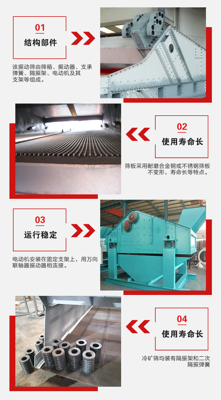 已廣泛用于冶金、礦山、煤炭、港口等工業部門。這種系列冷礦篩根據工作場地的狀況,電機可安裝在左側或右側;根據電機和激振器的安裝位置不同設計制造各種規格的冷礦振動篩。