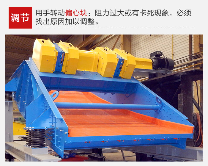 振動器裝配完畢后,用手轉動偏心塊,如阻力過大或有卡死現象,必須找出原因加以調整。